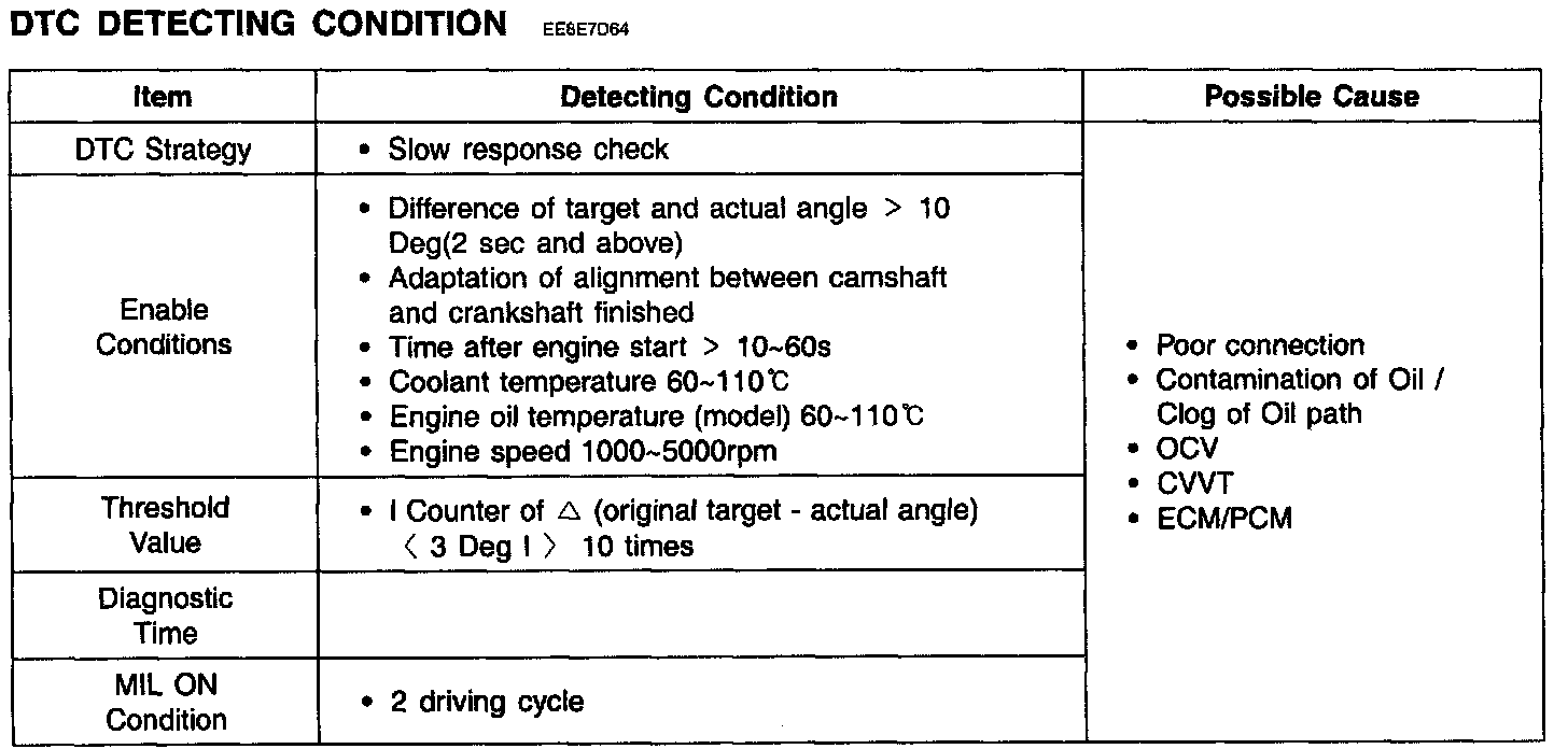 This diagnostic monitors the phasing response rate and determines whether the response rate is fast enough. A state machine is used to capture the response rate. The measured results are then compared to an allowable threshold. If "Counter of (original target - actual angle) < 3 Deg" is over 10 times under enable conditions, ECM/PCM sets DTC P0011.