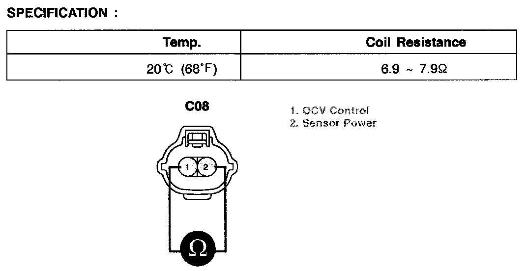 PCM controls OCV (0il Control Valve) with PWM (Pulse Width Modulator) signal to change oil passages supplying oil to CVVT that makes CAM position changes (advance or retard). OCV is integrated with oil filter and located on the engine block. The oil control valve is controlled by a pulse-width-modulated signal from the engine control unit. A duty cycle of zero commands the cam phaser to its default position. A duty cycle of 100 % commands the phaser to its maximum phased position. When the phaser must be controlled to an intermediate position, the duty cycle is maintained in the region of the 'hold position'. This is a medium duty cycle, usually between 35 % and 65 %, depending on temperature and voltage conditions. As the cam phaser is advanced and retarded, its position is measured using a toothed wheel. The wheel is attached to the camshaft, or to the cam phaser rotor. A sensor picks up the signal from the wheel and its output is read by the engine control unit. A cam signal is generated for each cam phaser on the engine. This requires a separate toothed wheel and cam sensor combination for each cam phaser. The cam signal and crank wheel signal are compared as the engine turns, and the phasing position is determined. The position is displayed in crank angle degrees, relative position from default. This position measurement is used as feedback for the position control software, which determines the required percent duty cycle commanded to the oil control valve.