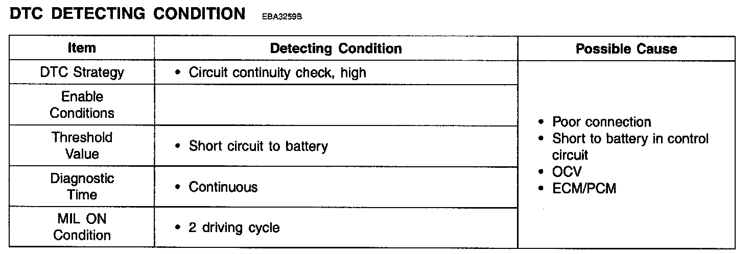 When ECM/PCM detects short to power in OCV control circuit, ECM/PCM sets DTC P0077.