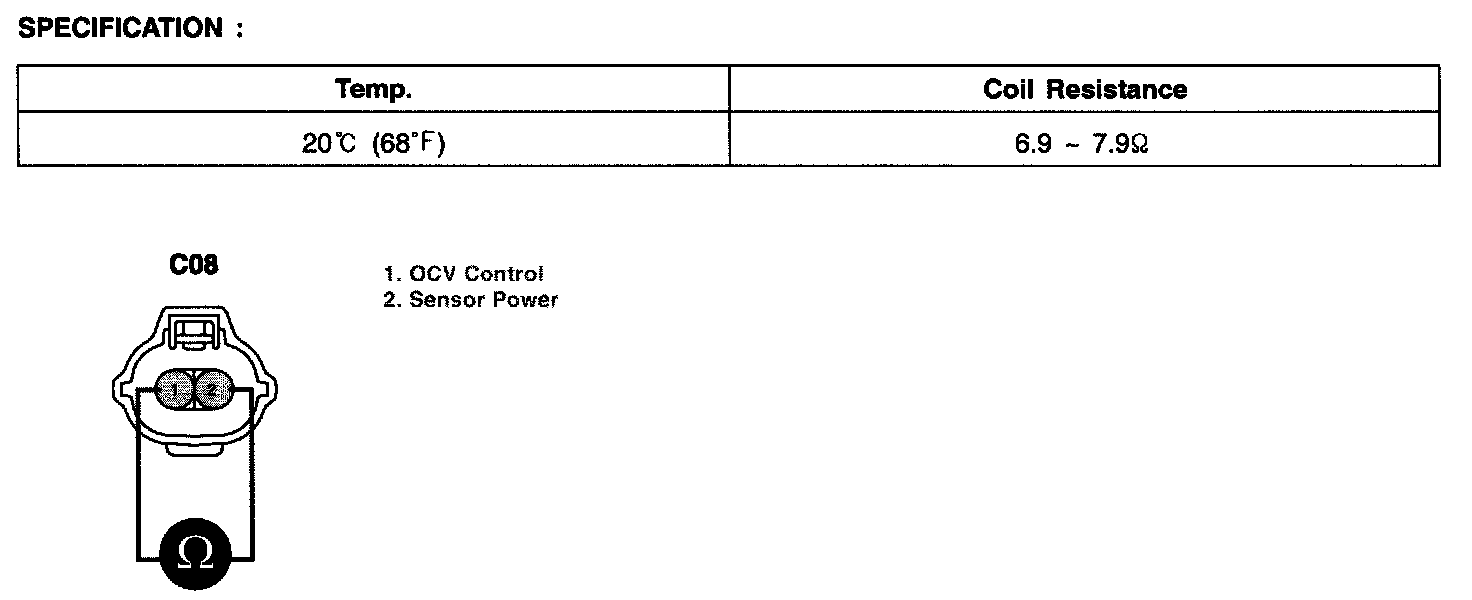 PCM controls OCV (0il Control Valve) with PWM (Pulse Width Modulator) signal to change oil passages supplying oil to CVVT that makes CAM position changes (advance or retard). OCV is integrated with oil filter and located on the engine block. The oil control valve is controlled by a pulse-width-modulated signal from the engine control unit. A duty cycle of zero commands the cam phaser to its default position. A duty cycle of 100 % commands the phaser to its maximum phased position. When the phaser must be controlled to an intermediate position, the duty cycle is maintained in the region of the 'hold position'. This is a medium duty cycle, usually between 35% and 65%, depending on temperature and voltage conditions. As the cam phaser is advanced and retarded, its position is measured using a toothed wheel. The wheel is attached to the camshaft, or to the cam phaser rotor. A sensor picks up the signal from the wheel and its output is read by the engine control unit. A cam signal is generated for each cam phaser on the engine. This requires a separate toothed wheel and cam sensor combination for each cam phaser. The cam signal and crankwheel signal are compared as the engine turns, and the phasing position is determined. The position is displayed in crank angle degrees, relative position from default. This position measurement is used as feedback for the position control software, which determines the required percent duty cycle commanded to the oil control valve.