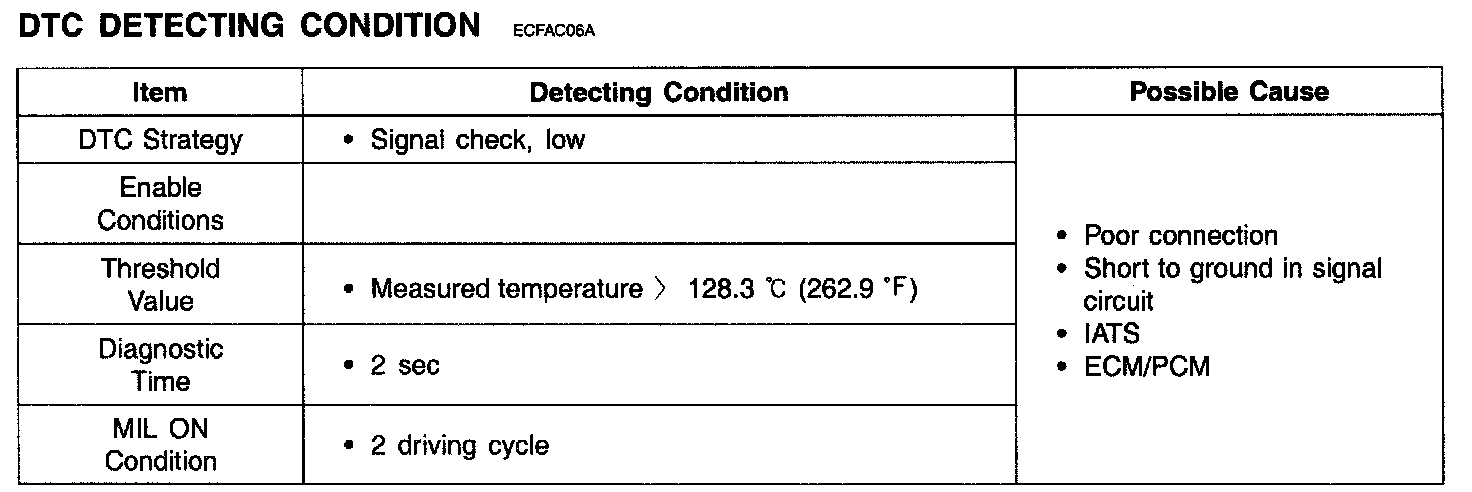 If measured temperature is higher than the maximum threshold value during 2 sec, ECM/PCM sets DTC P0112. (In this case, the input signal voltage is the minimum threshold value.)
