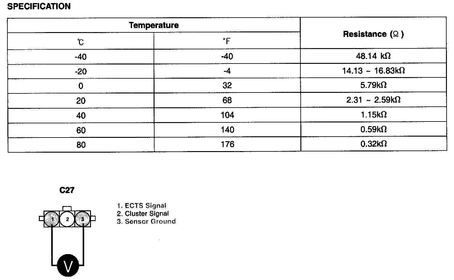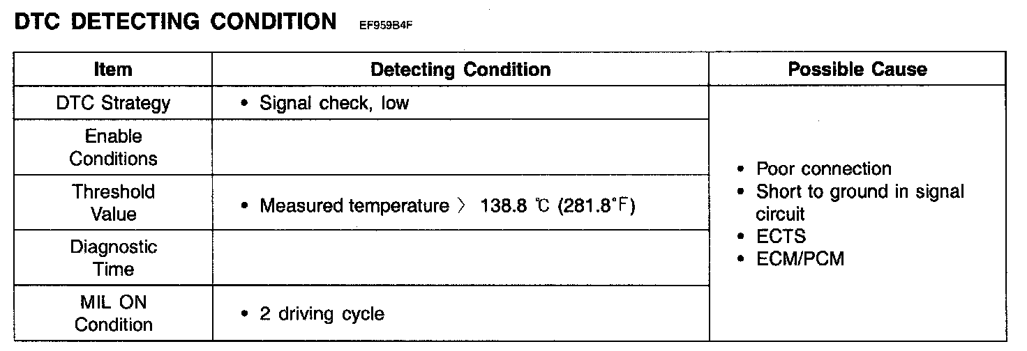 If measured temperature is higher than the maximum threshold value, ECM/PCM sets DTC P0117. (In this case, the input signal voltage is the minimum threshold value.)