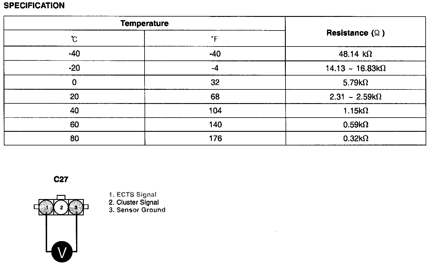 If measured temperature is lower than the minimum threshold value, ECM/PCM sets DTC P0118.(In this case, the input signal voltage is the maximum threshold value.)