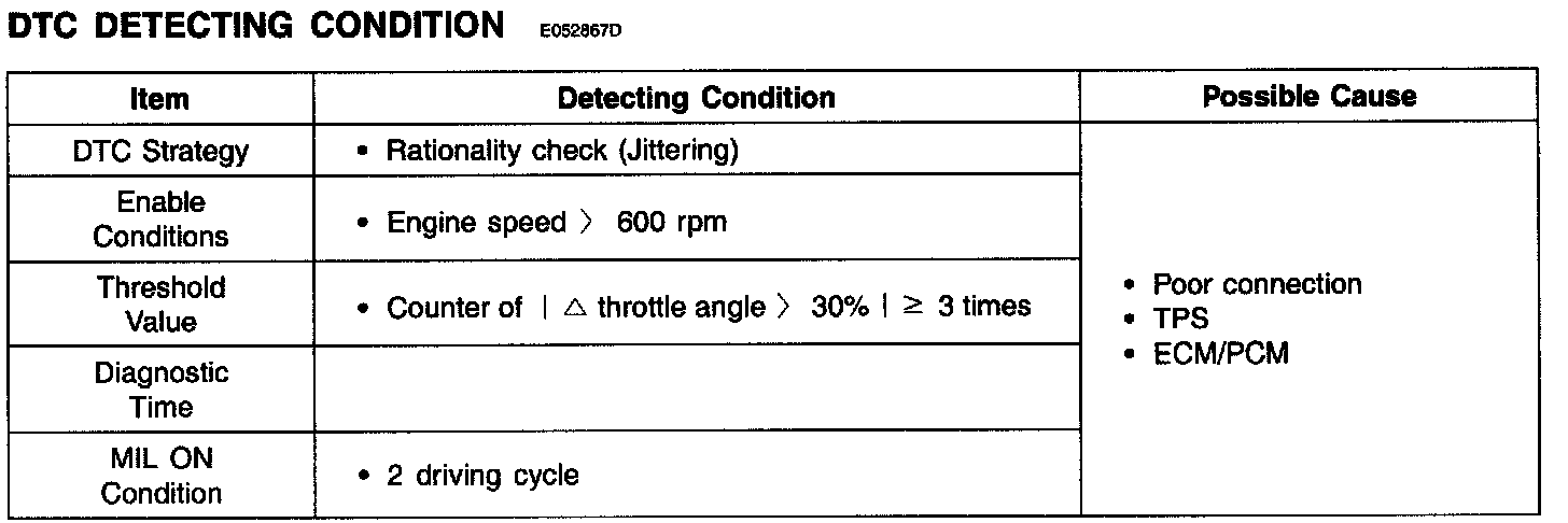 Once enable conditions are met, if the number of times that the throttle angle input signal rapidly increases over 30 % is greater than or equal to 3, P0121 is set.