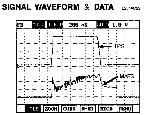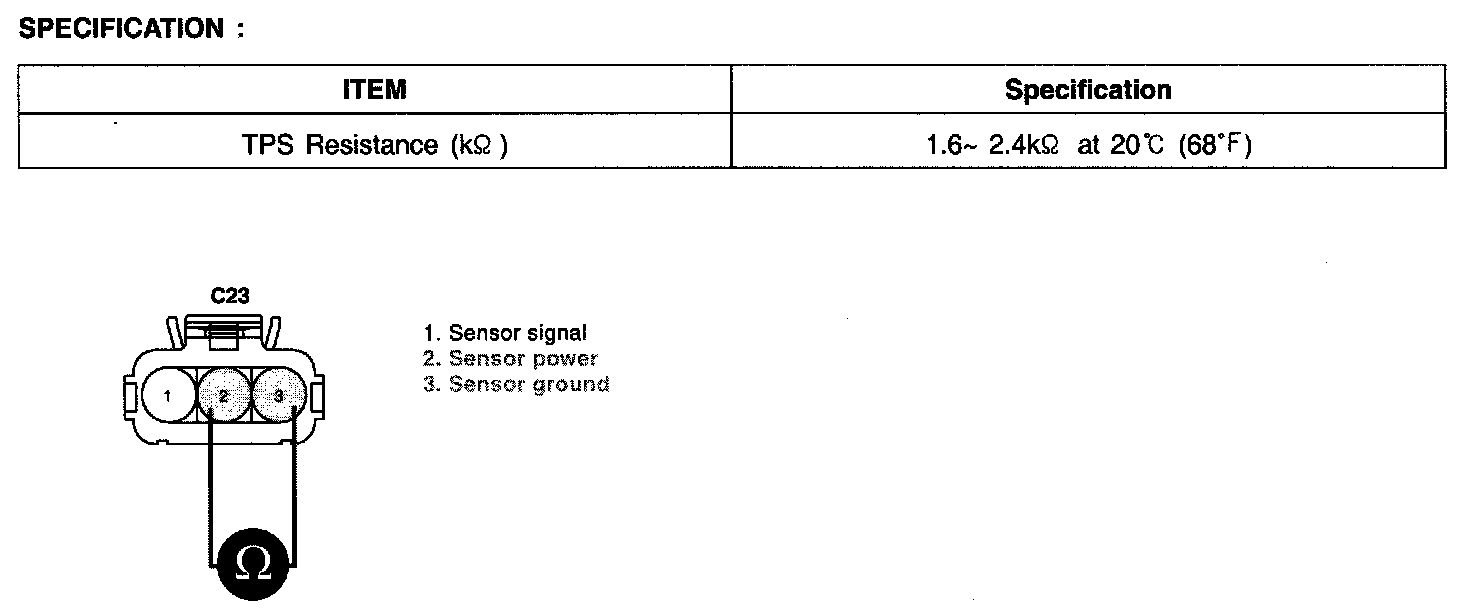 The Throttle Position Sensor (TPS) is mounted on the throttle body and detects the opening angle of the throttle plate. The TPS has a variable resistor (potentiometer) whose characteristic is the resistance changing according to the throttle angle. During acceleration, the TPS resistance between the reference 5 V and the signal terminal decreases and output voltage increases; during deceleration, the TPS resistance increases and TPS output voltage decreases. The ECM/PCM supplies a reference 5 V to the TPS and the output voltage increases directly with the opening of the throttle valve. The TPS output voltage will vary from 0.2-0.8 V at closed throttle to 4.3-4.8 V at wide-open throttle. The ECM/PCM determines operating conditions such as idle (closed throttle), part load, acceleration/deceleration, and wide-open throttle from the TPS. Also The ECM/PCM uses the Mass Air Flow Sensor (MAFS) or Manifold Absolute Pressure Sensor (MAPS) signal along with the TPS signal to adjust fuel injection duration and ignition timing.