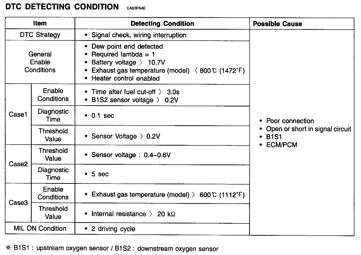 If the signal output satisfies the threshold value under enable conditions, ECM/PCM sets DTC P0134.(This DTC might be caused by the malfunction of Heater circuit, so, check the heater circuit first).
