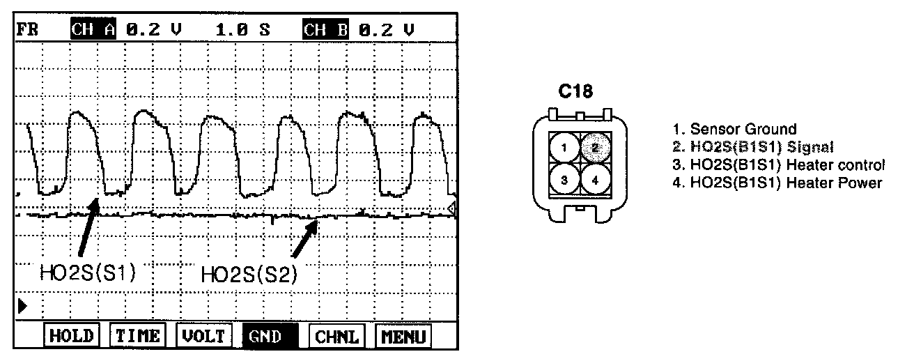 2. Connect probe to terminal 2 of HO2S (B1/S1) connector and select oscilloscope function with scantool.