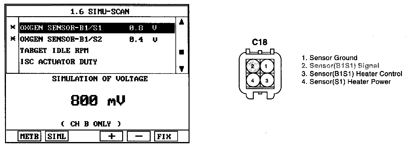 If you release the accelerator pedal suddenly after engine running about 4000 rpm, fuel supply will stop for short period and the O2 sensor service data in the Hi-Scan (Pro) will display values 200 mV or lower. When you suddenly press on the accelerator pedal down, the voltage will reach 0.6 - 1.0 V. When you let the engine idle again, the voltage will fluctuate between 200 mV or lower and 0.6 - 1.0 V. In this case, the O2 sensor can be determined as good.