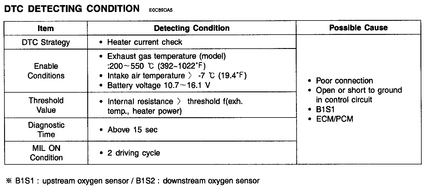 If ECM/PCM detects that the internal resistance of heater is out of threshold value, ECM/PCM sets DTC P0135.