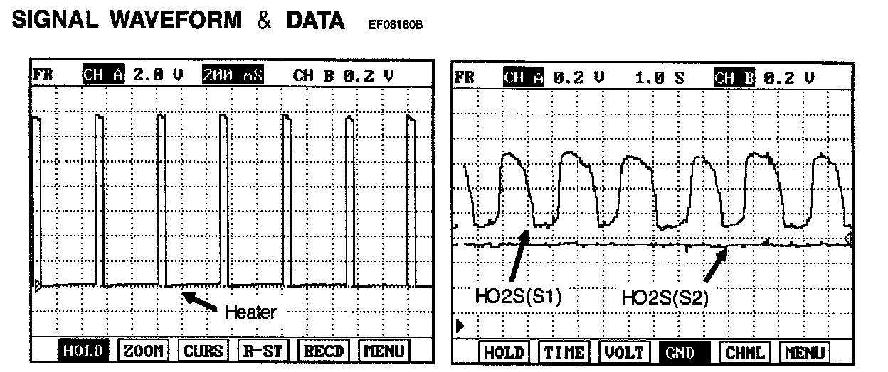 The heated oxygen sensors are mounted on the front side and the rear side of Catalytic Converter (warm-up catalytic converter), which detects the oxygen concentration in the exhaust gas. The front HO2S signal is used to control air/fuel ratio (closed loop fuel control) and the rear HO2S signal is used to monitor front HO2S and catalyst for proper operation. The heated oxygen sensor (HO2S) produces a voltage that varies between 0 V and 1 V. When the air/fuel ratio is lean, the oxygen concentration in the exhaust gas increases and the front HO2S outputs a low voltage (approximately 0 - 0.4 V). When the air/fuel ratio is rich, the oxygen concentration in the exhaust gas decreases and the front HO2S outputs a high voltage (approximately 0.6 - 1 V). The ECM/PCM constantly monitors the HO2S and increases or decreases the fuel injection duration by using the HO2S signal, which is called closed-loop fuel control operation.
