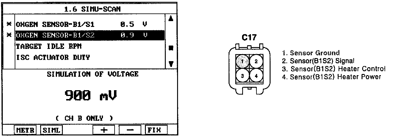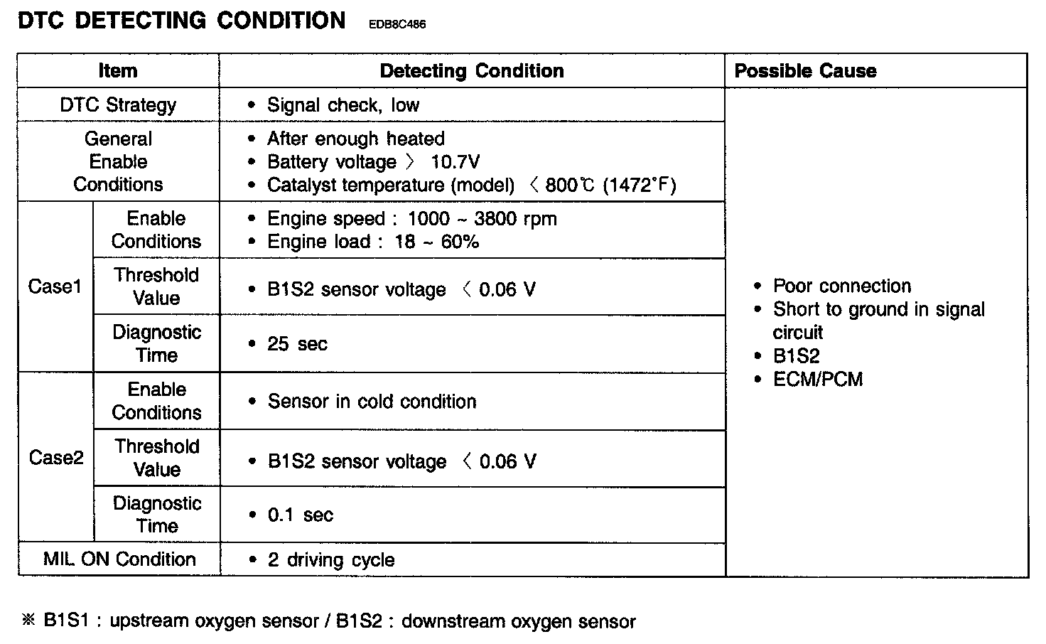 HO2S (B1/S2) is in the rear side of Catalytic Converter to check the proper operation of catalyst. Oxygen density after the catalytic converter has to be within specific range (around 0.5 V when there is no acceleration and deceleration). If the oxygen density changes in accordance with HO2S (B1/S1), it means the poor performance of catalytic converter.