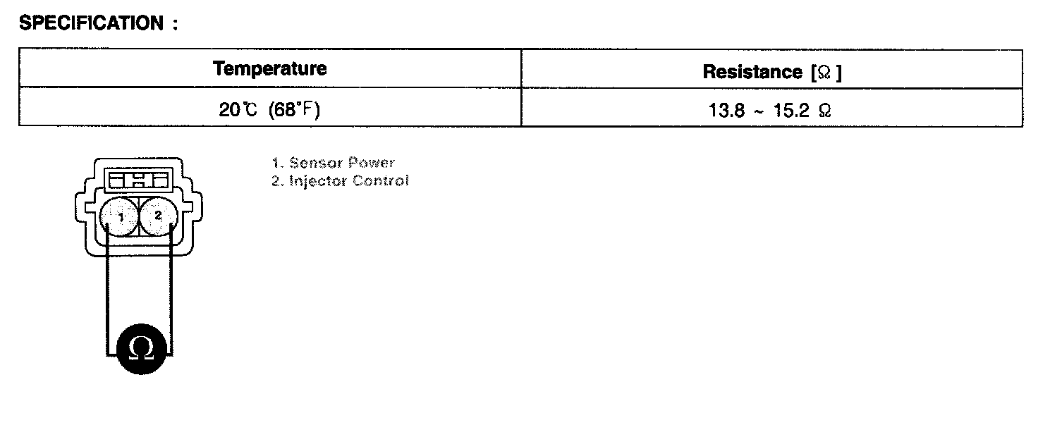4. Measure resistance terminal 1 and 2 of Injector connector (Component side).
