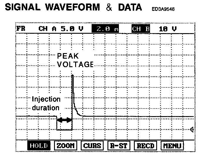 When the ECM/PCM energizes the injector by grounding the control circuit, the circuit voltage will drop (theoretically 0 V) and fuel is injected. When the injector in de-energized, the fuel injector is closed and the circuit voltage will momentarily peak.