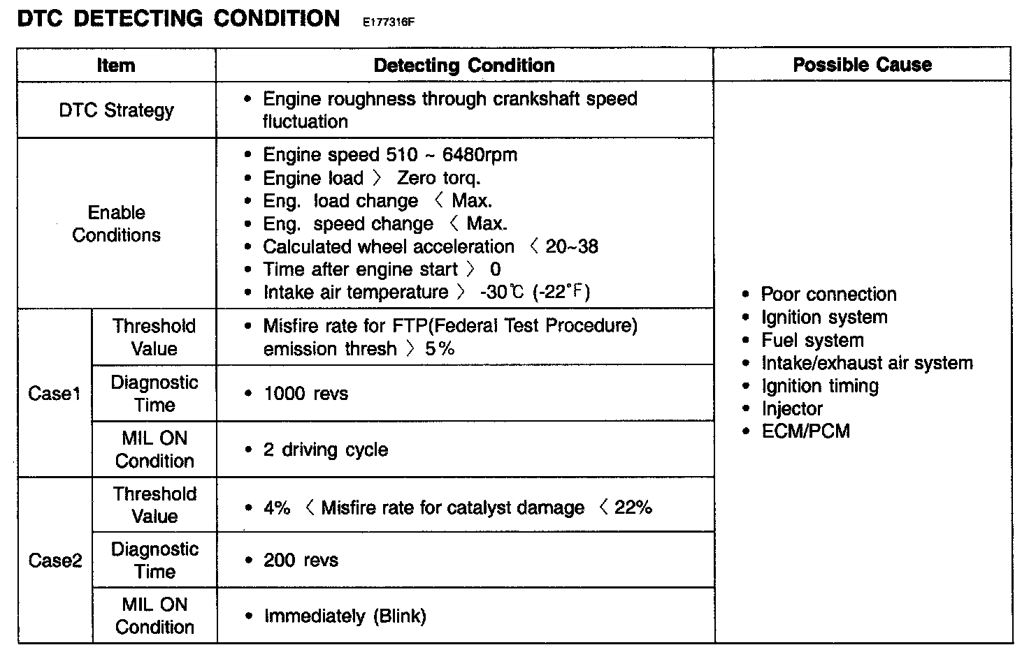 Misfires can be caused by lack of combustion in a cylinder due to absence of spark, poor fuel metering, poor compression, or many other causes. Even a small number of misfires may result in excessive exhaust emissions due to the unburned mixture. Increased misfire rates cause damage to the catalytic converter. The PCM monitors the crankshaft speed variation to determine if any misfiring generated. The PCM identifies the specific cylinder in which the misfire has occurred and counts individual misfire events by monitoring changes in the crankshaft rotation for each cylinder. A random misfire indicates one or more cylinders are misfiring.