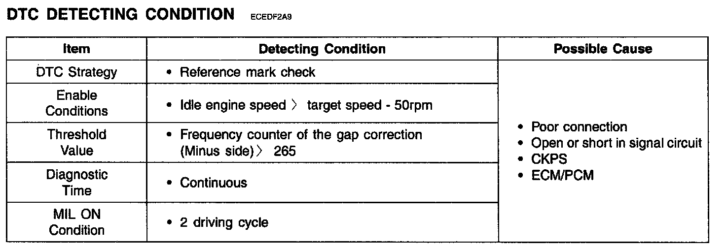 The PCM controls the injection and ignition timing by using these signals. Generally CKPS signal is used to detect the piston's position and CMPS signal is used to detect the Top Dead Center of each cylinder.