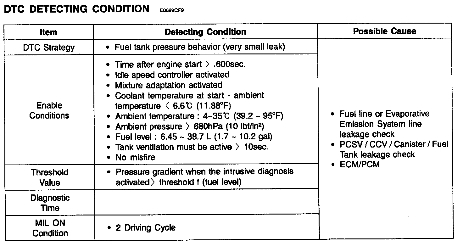 This test detects a leak by measuring an increase of vacuum in the fuel evaporative system. A leak in evaporative system can allow to leak hydrocarbons from the tank to the atmosphere when the engine is off. The test should be calibrated to detect 0.02" (0.5 mm) leakage or less. If there is a very small leak above the threshold value in the fuel evaporative system, ECM/PCM sets P0456.