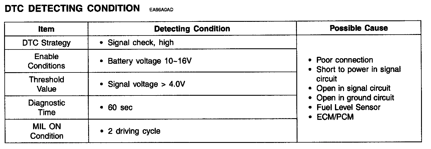 If the signal voltage is over 4.0 V during 60 sec or more, ECM/PCM sets DTC P0463.