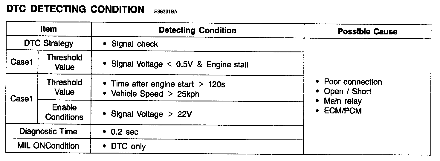 The main relay voltage is monitored for high or low voltage values that may indicate main relay, main relay circuit, or engine electrical system malfunctions.