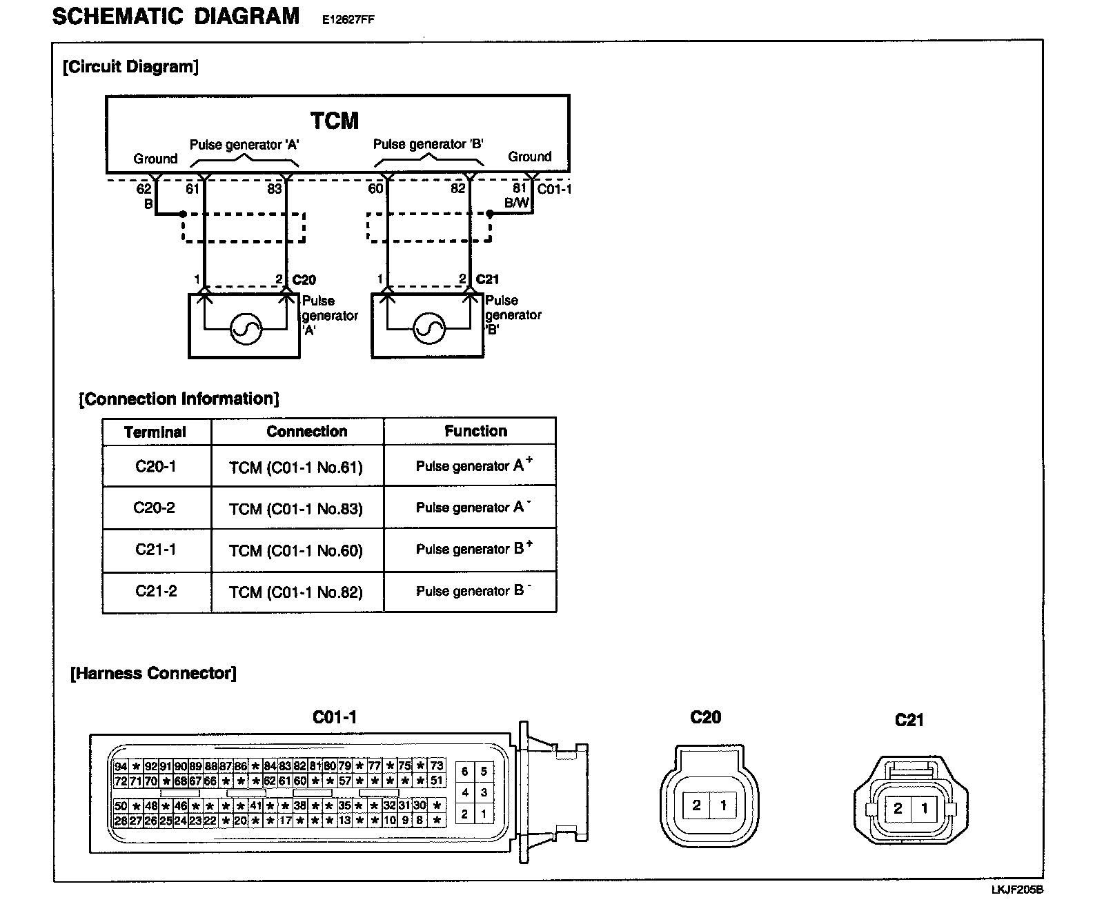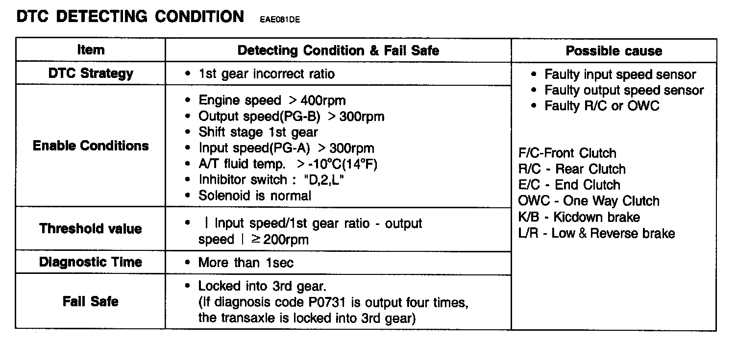 This code is set if the value of input shaft speed is not equal to the value of the output shaft, when multiplied by the 1st gear ratio, while the transaxle is engaged in 1st gear. This malfunction is mainly caused by mechanical troubles such as control valve sticking or solenoid valve malfunctioning rather than an electrical issue.