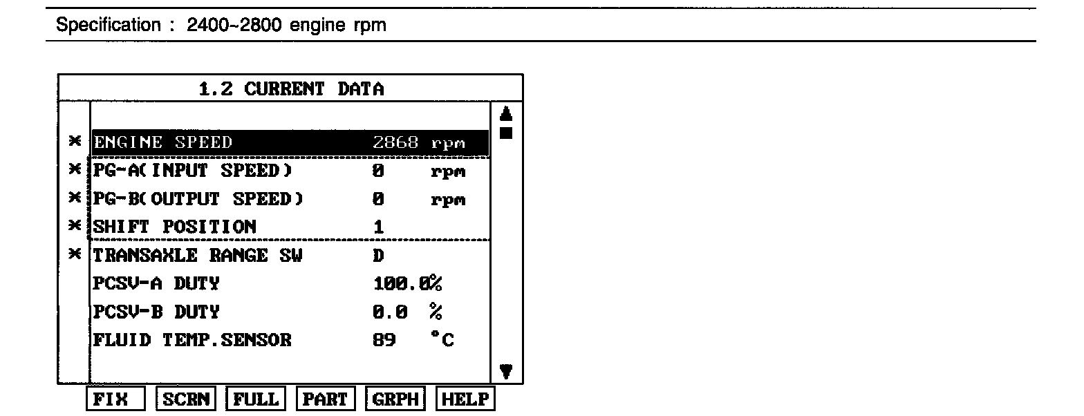 2. Fully depress the brake pedal, then place the transaxle gear lever into "ID" range. Press and hold the accelerator pedal to the floor for no more than eight seconds while observing the engine, input speed, and output speed RPM value.