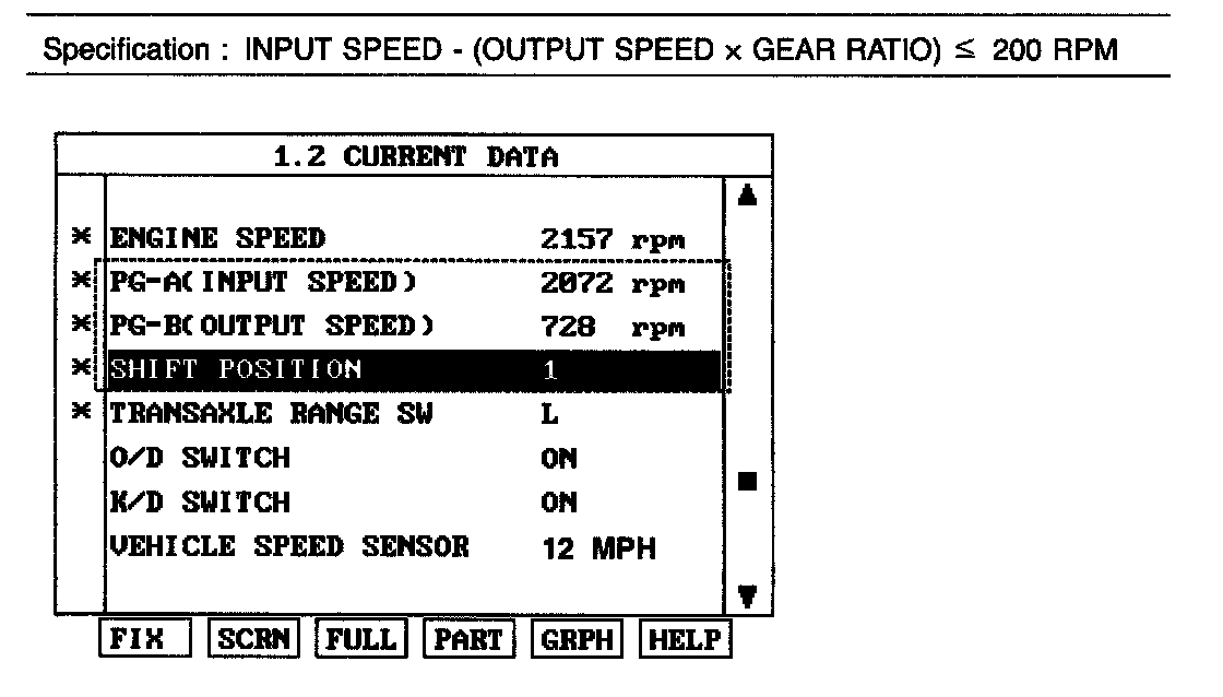 3. Monitor the "ENGINE SPEED, INPUT SPEED SENSOR(PG-A), OUTPUT SPEED SENSOR(PG-B), GEAR POSITION" parameter on the scan tool.