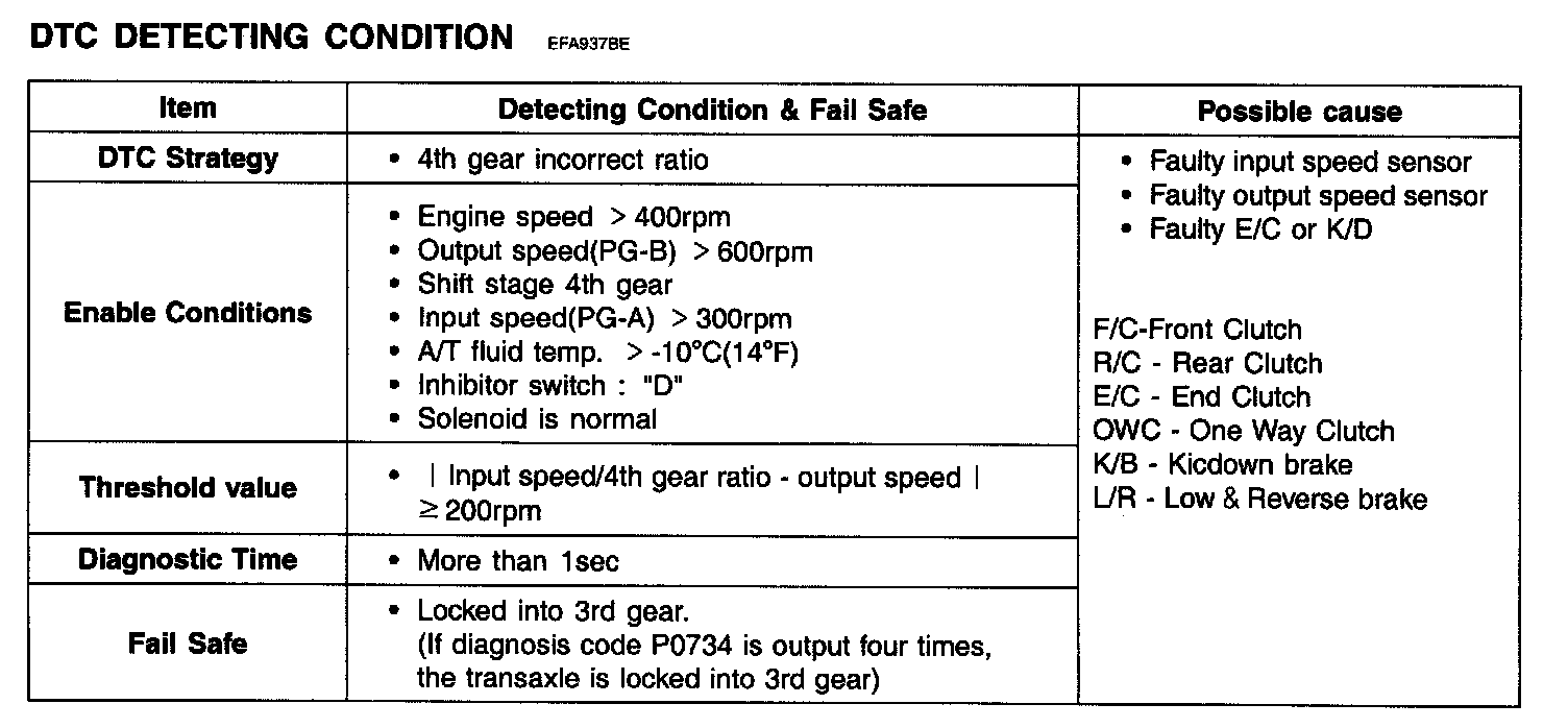 This code is set if the value of input shaft speed is not equal to the value of the output shaft, when multiplied by the 4th gear ratio, while the transaxle is engaged in 4th gear. This malfunction is mainly caused by mechanical troubles such as control valve sticking or solenoid valve malfunctioning rather than an electrical issue.