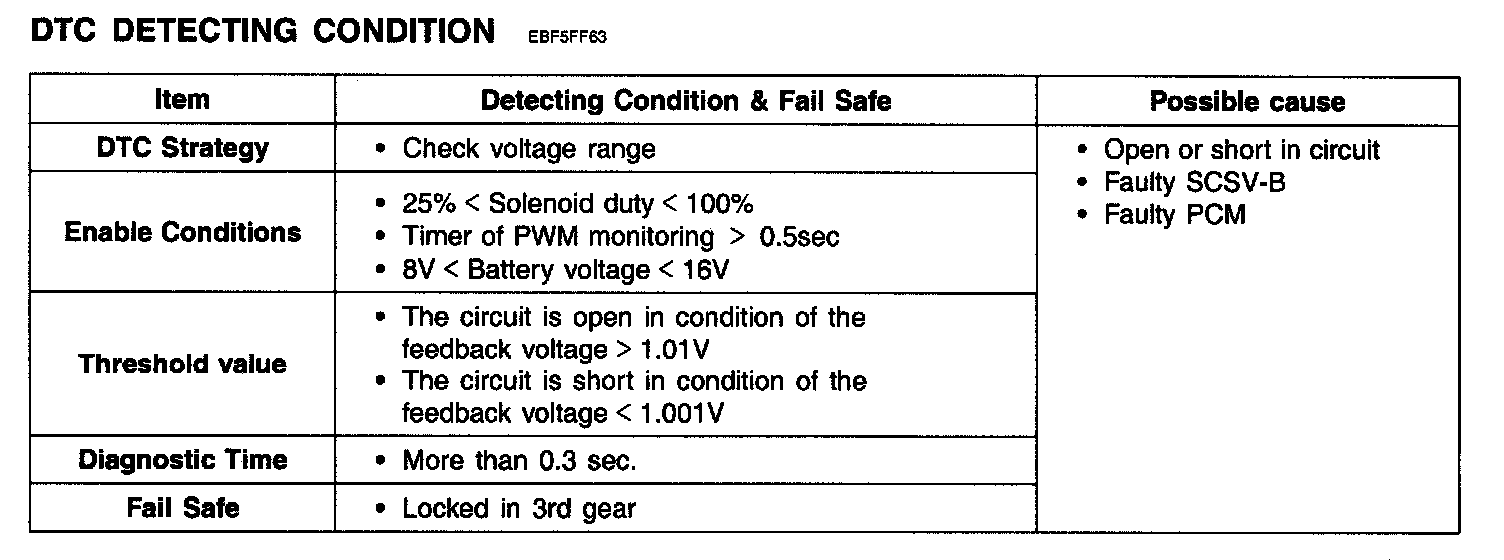 The PCM checks the Shift Control Solenoid Valve B control signal by monitoring the feedback signal from the solenoid valve drive circuit. If an unexpected signal is monitored, (For example, high voltage is detected when low voltage is expected, or low voltage is detected when high voltage is expected) the PCM judges that SCSV B control solenoid circuit is malfunctioning and sets this code.