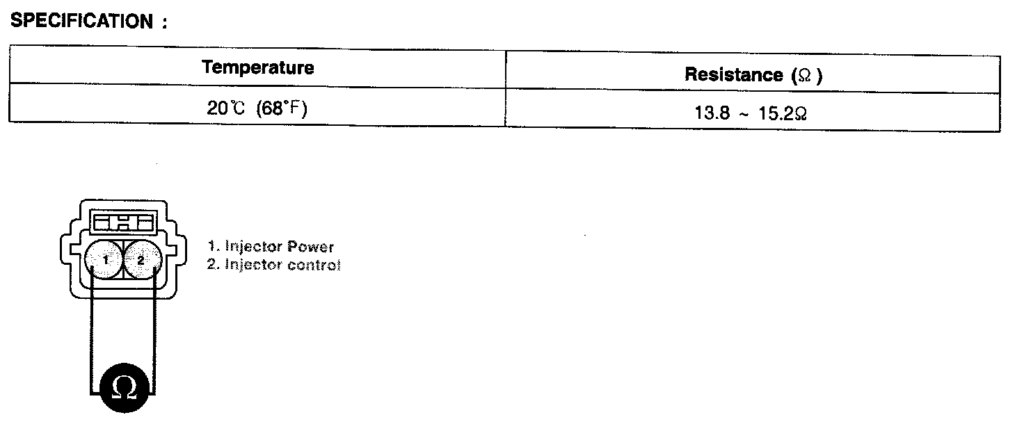 4. Measure the resistance between terminal 1 and 2 of injectors (Component side).