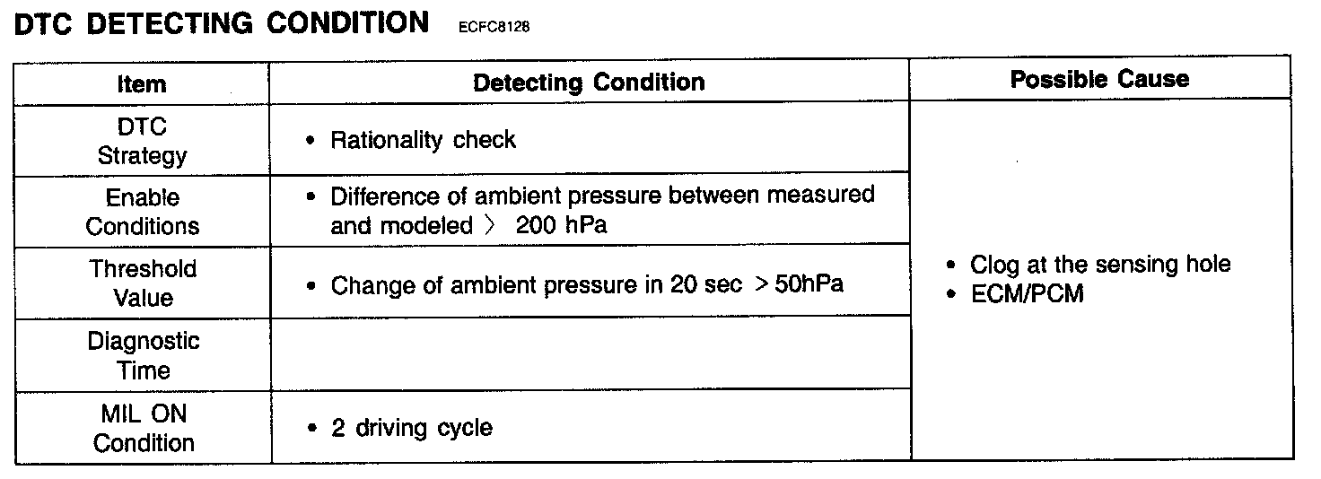 If the change of ambient pressure value is over 50 hPa during 20 sec or more, ECM/PCM sets DTC P2226.