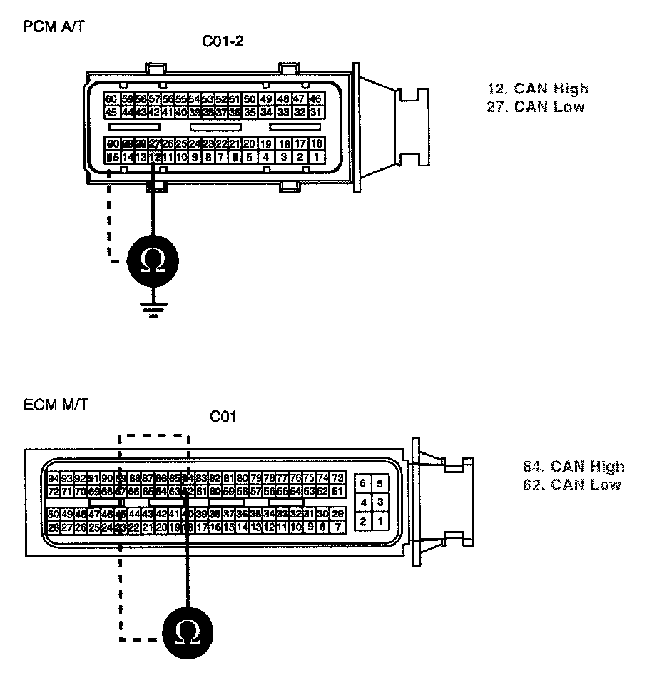 4. Measure the resistance between terminal 27/C01-2 of ECM/PCM harness connector and chassis ground. [A/T]