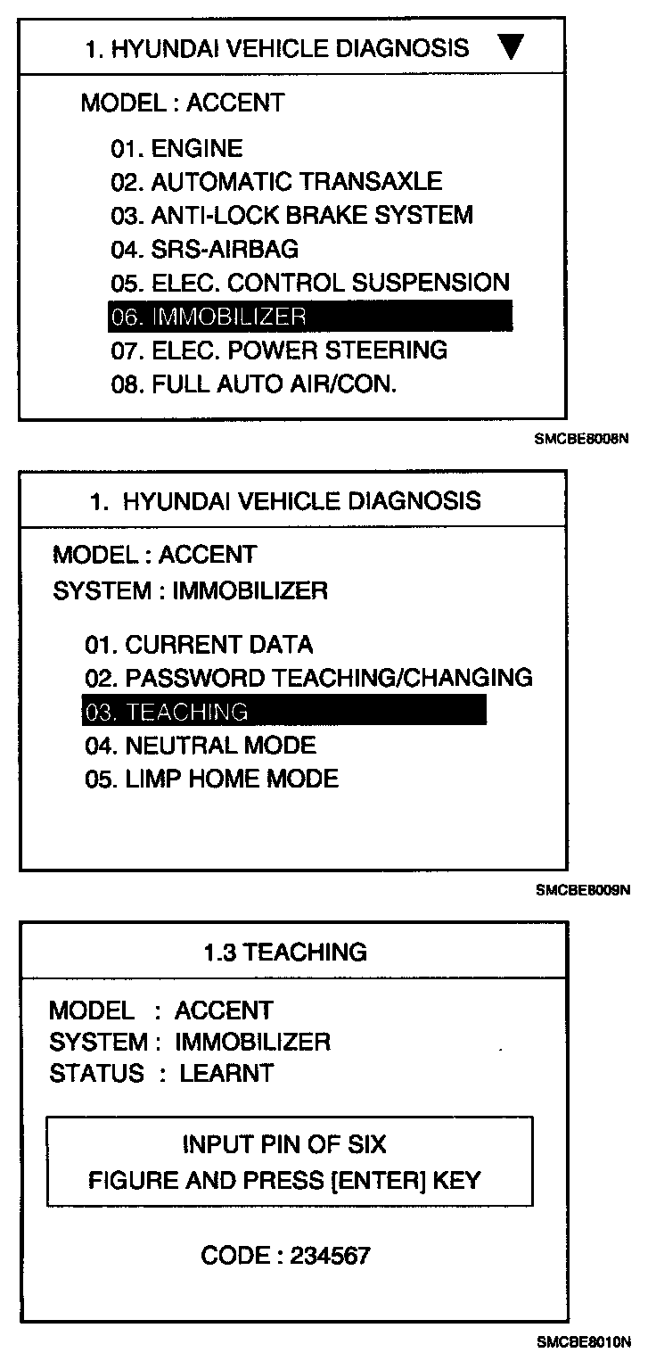 The procedure starts with an PCM (ECM) request for vehicle specific data (PIN code: 6 digits) from the tester. The "virgin" PCM (ECM) stores the vehicle specific data and the key teaching can be started. The "learnt" PCM (ECM) compares the vehicle specific data from the tester with the stored data. If the data are correct, the teaching can proceed.