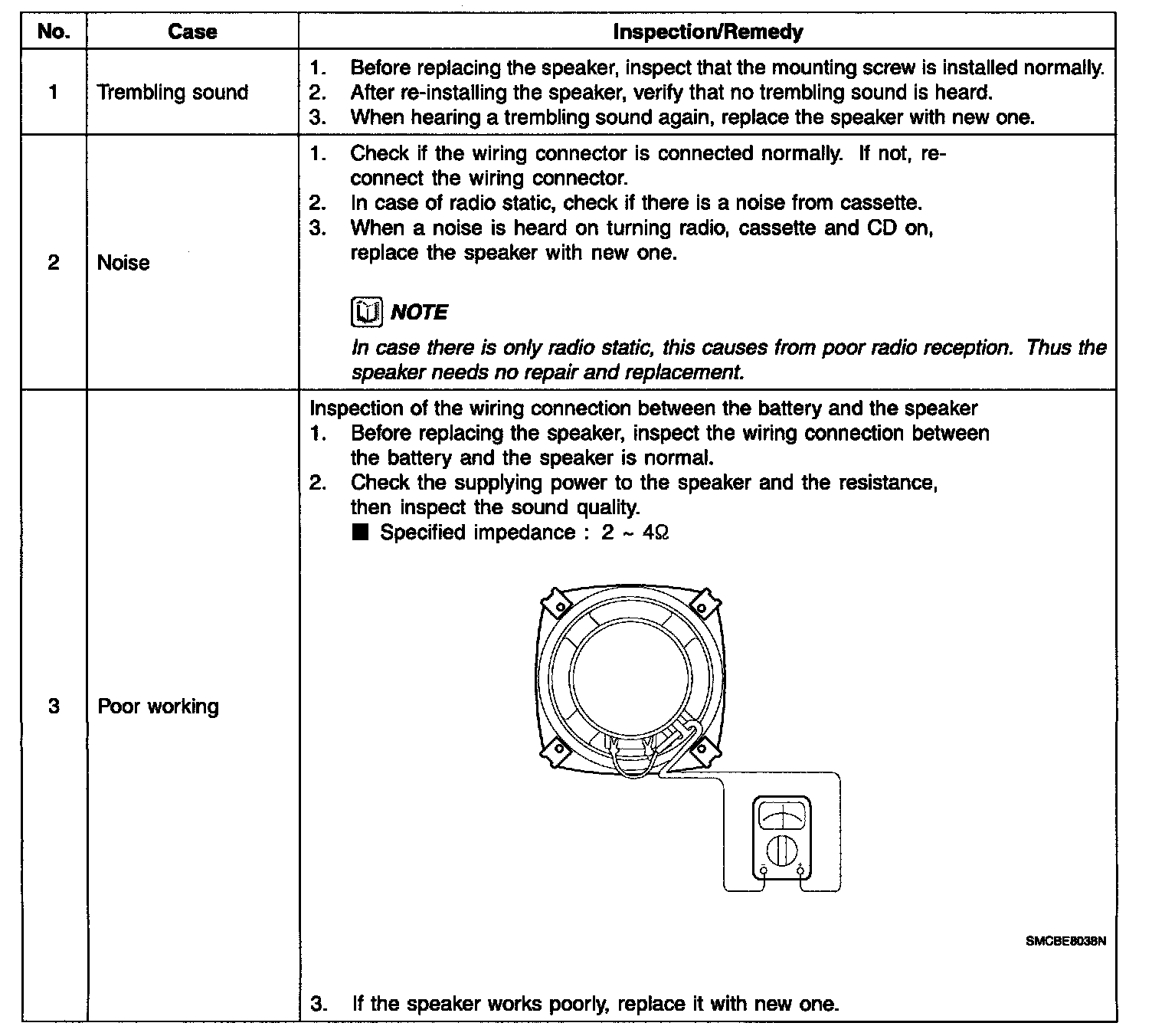 Inspect the sound from speaker after verifying that the speaker mounting screws is removed and the wiring connector is connected precisely to remove vibration transmitted from body trims and surrounding parts.