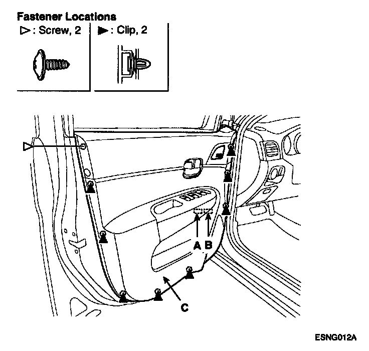 3. Loosen the door trim mounting screws. Disconnect the power window switch connector (A), power mirror connector (B). Remove the door trim (C).