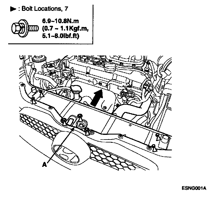 2. Pull to the arrow direction after loosen the radiator mounting bolts then remove the hood latch (A).