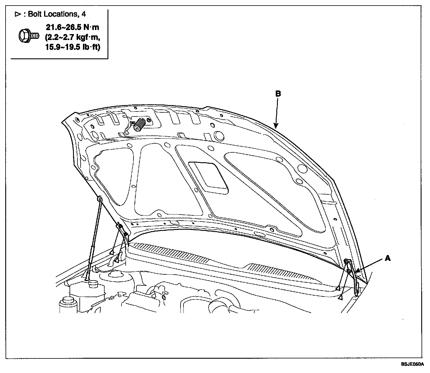 2. After loosening the hood hinge (A) mounting bolts, remove the hood (B).