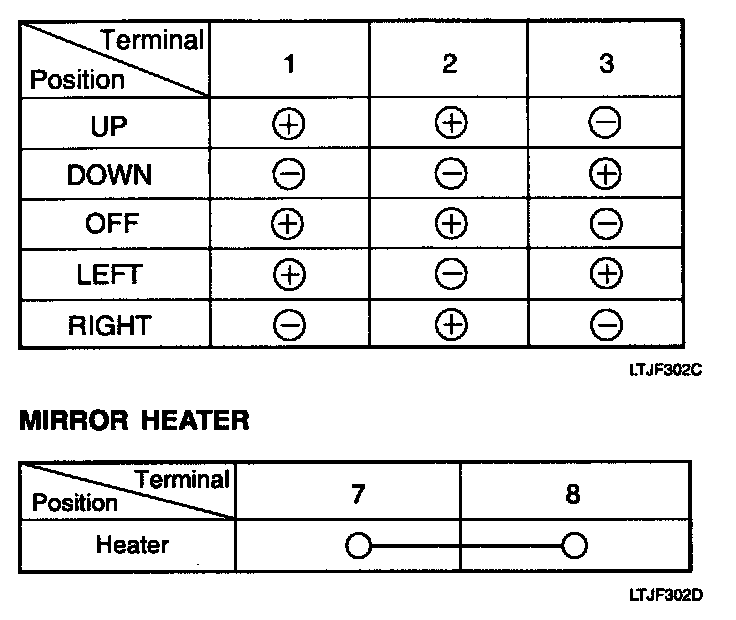 4. Apply battery voltage to each terminal as shown in the table and verify that the mirror operates properly.