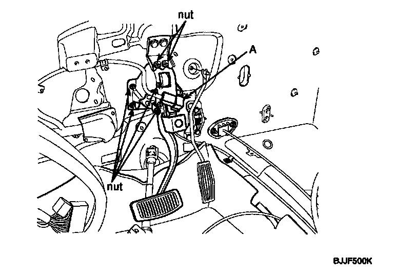 6. Remove the brake pedal member assembly mounting nuts and then remove the brake pedal assembly.