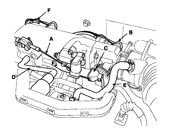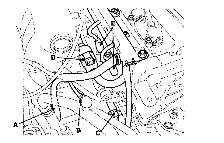 9. Disconnect the PCSV(Purge Control Solenoid Valve) (D) and water temperature sensor connector(E).
