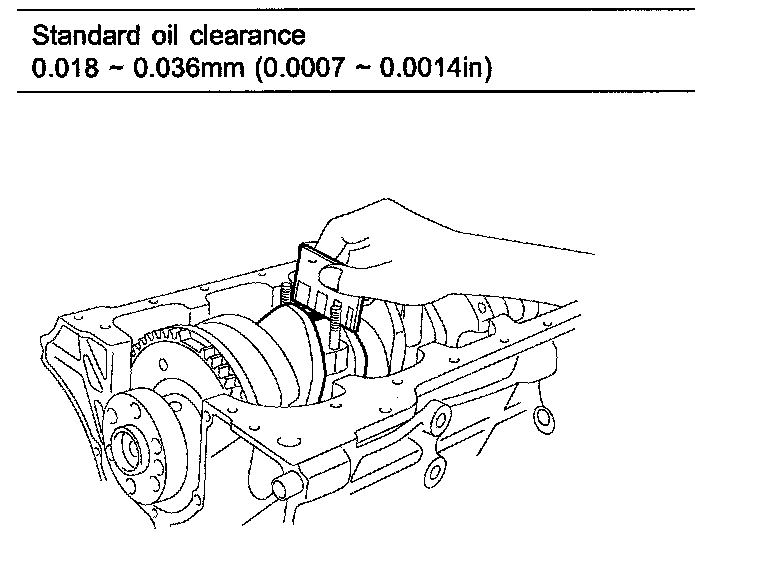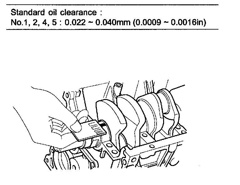 6) If the plastigage measures too wide or too narrow, remove the upper and lower bearing and then install a new bearings with the same color mark. (Refer to crankshaft main bearing selection table)