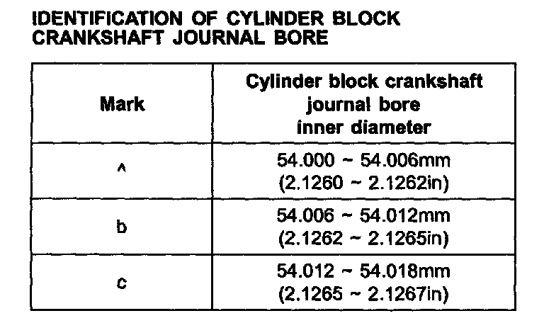 IDENTIFICATION OF CYLINDER BLOCK CRANKSHAFT JOURNAL BORE: