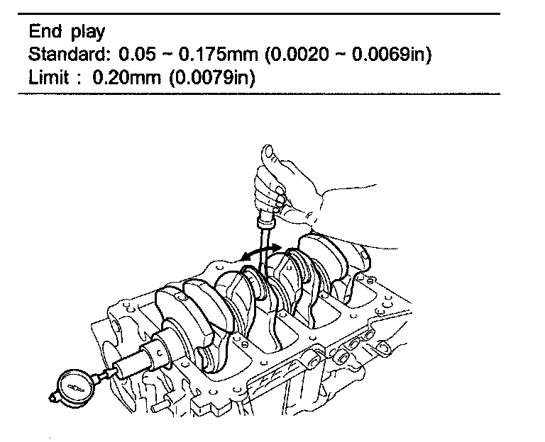 Using a dial indicator, measure the thrust clearance while prying the crankshaft back and forth with a screwdriver.