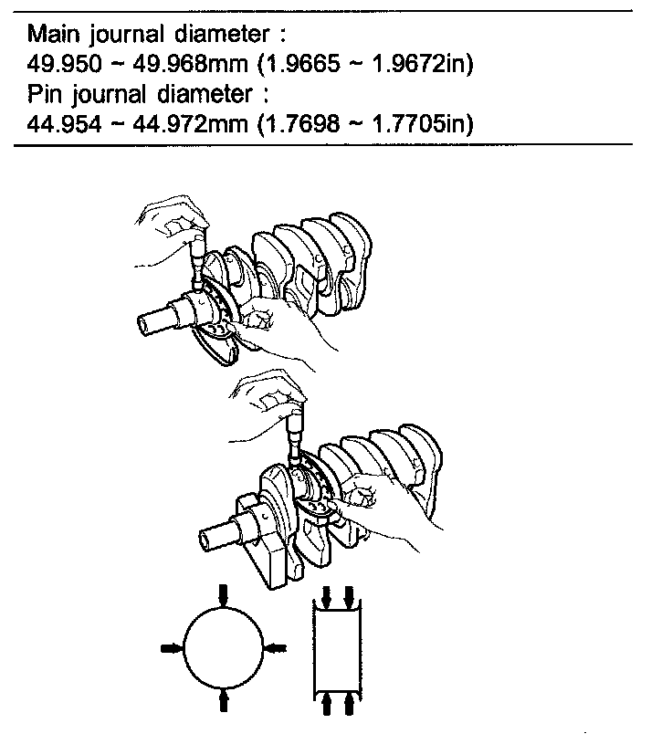 6. Inspect the crankshaft main journals and pin journals. Using a micrometer, measure the diameter of each main journal and pin journal.