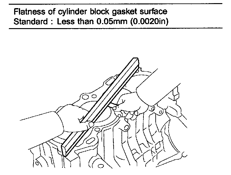 3. Inspect the top surface of cylinder block for flatness. Using a precision straight edge and feeler gauge, measure the surface contacting the cylinder head gasket for warpage.
