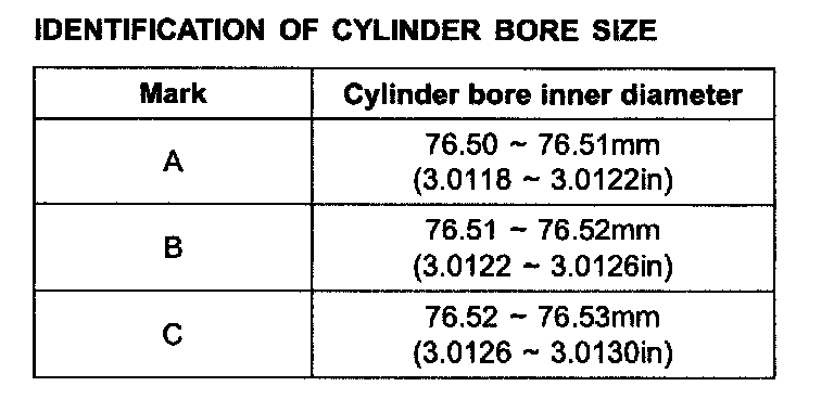 IDENTIFICATION OF CYLINDER BORE SIZE:
