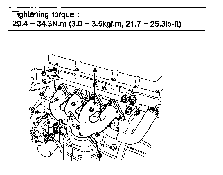 5. Remove the stay(A) of the exhaust manifold and catalytic converter assembly.