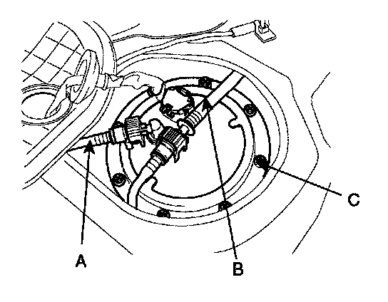 3. Unscrew the fuel pump mounting bolts (C) and remove the fuel pump assembly.