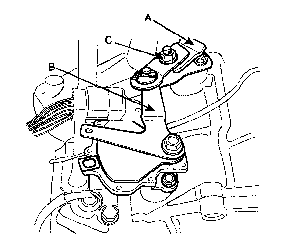 2. Loosen the control cable(A) to manual control lever flange nut(C) to free the cable and lever(B).