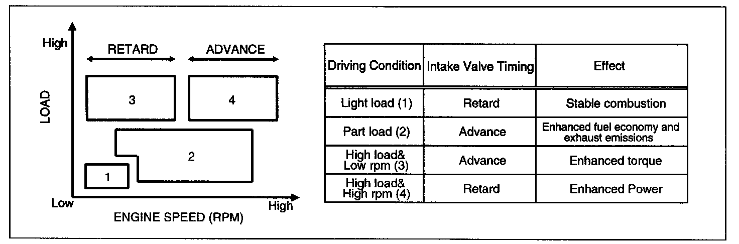 This CVVT system improves fuel efficiency and reduces NOx emissions at all levels of engine speed, vehicle speed, and engine load by EGR effect because of valve over-lap optimization.