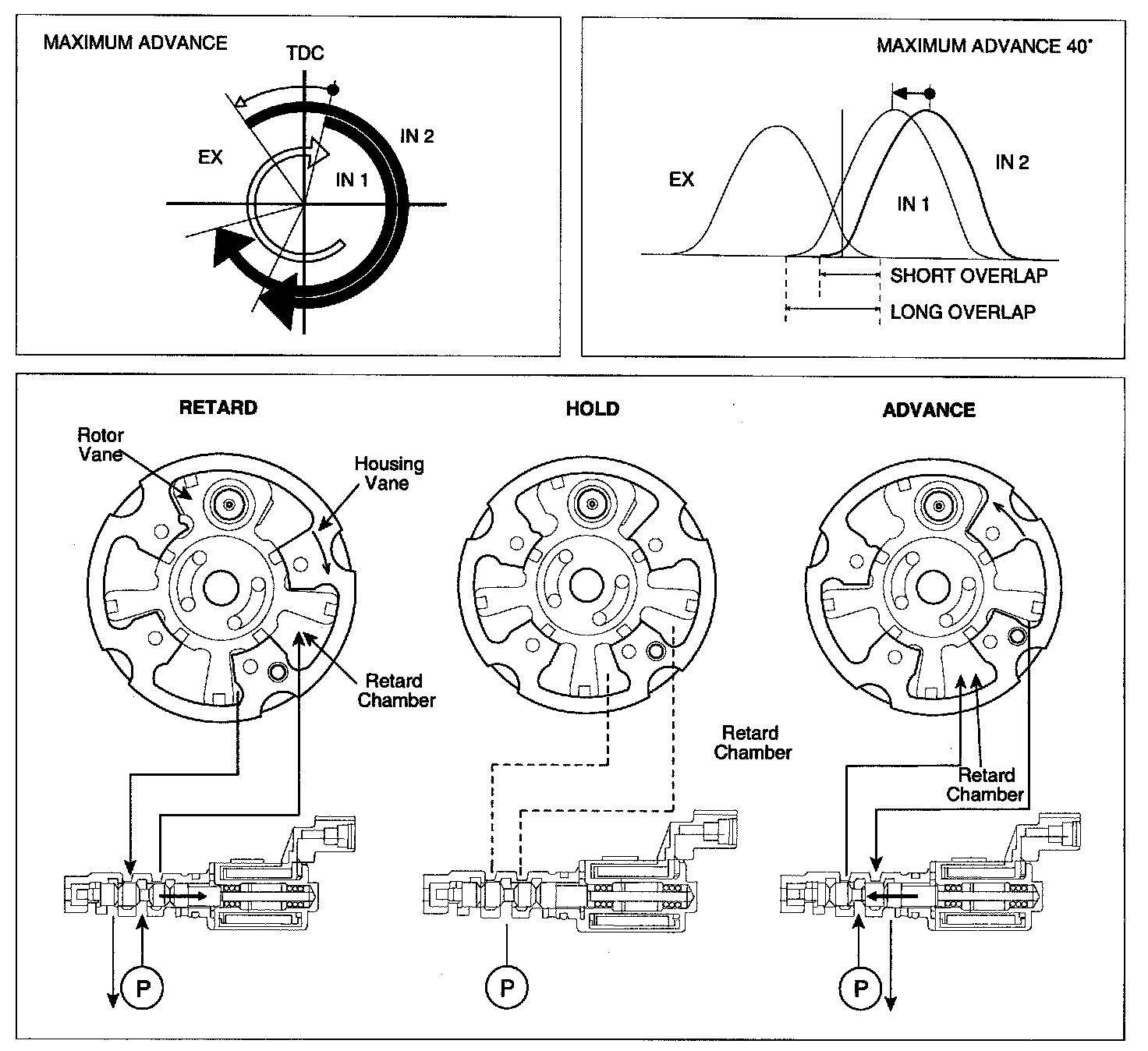 Cam angle is advanced to obtain the EGR effect and reduce pumping loss. The intake valve is closed quickly to reduce the entry of the air/fuel mixture into the intake port and improve the changing effect. Reduces the cam advance at idle, stabilizes combustion, and reduces engine speed.