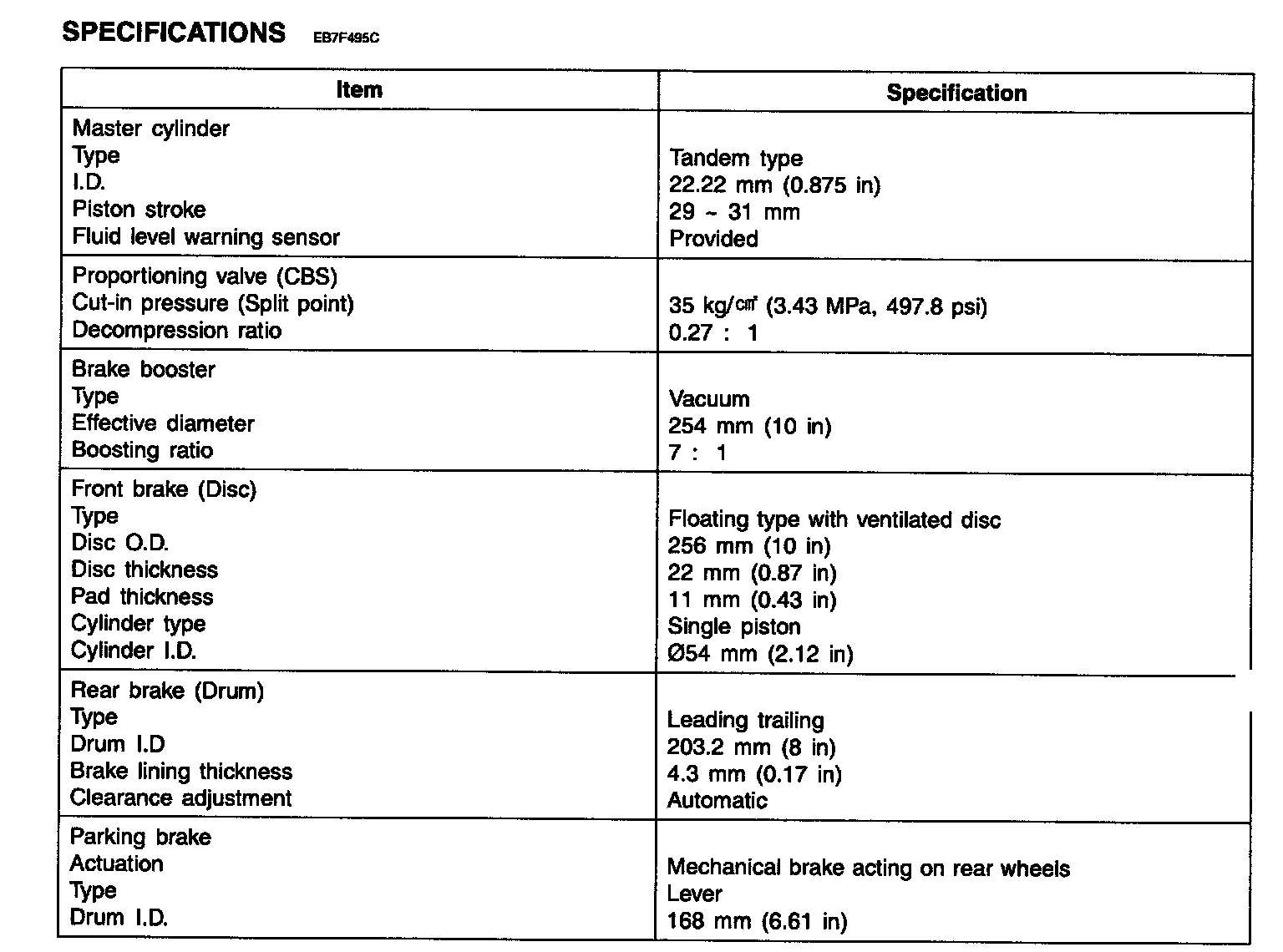 Brake System General Specifications: